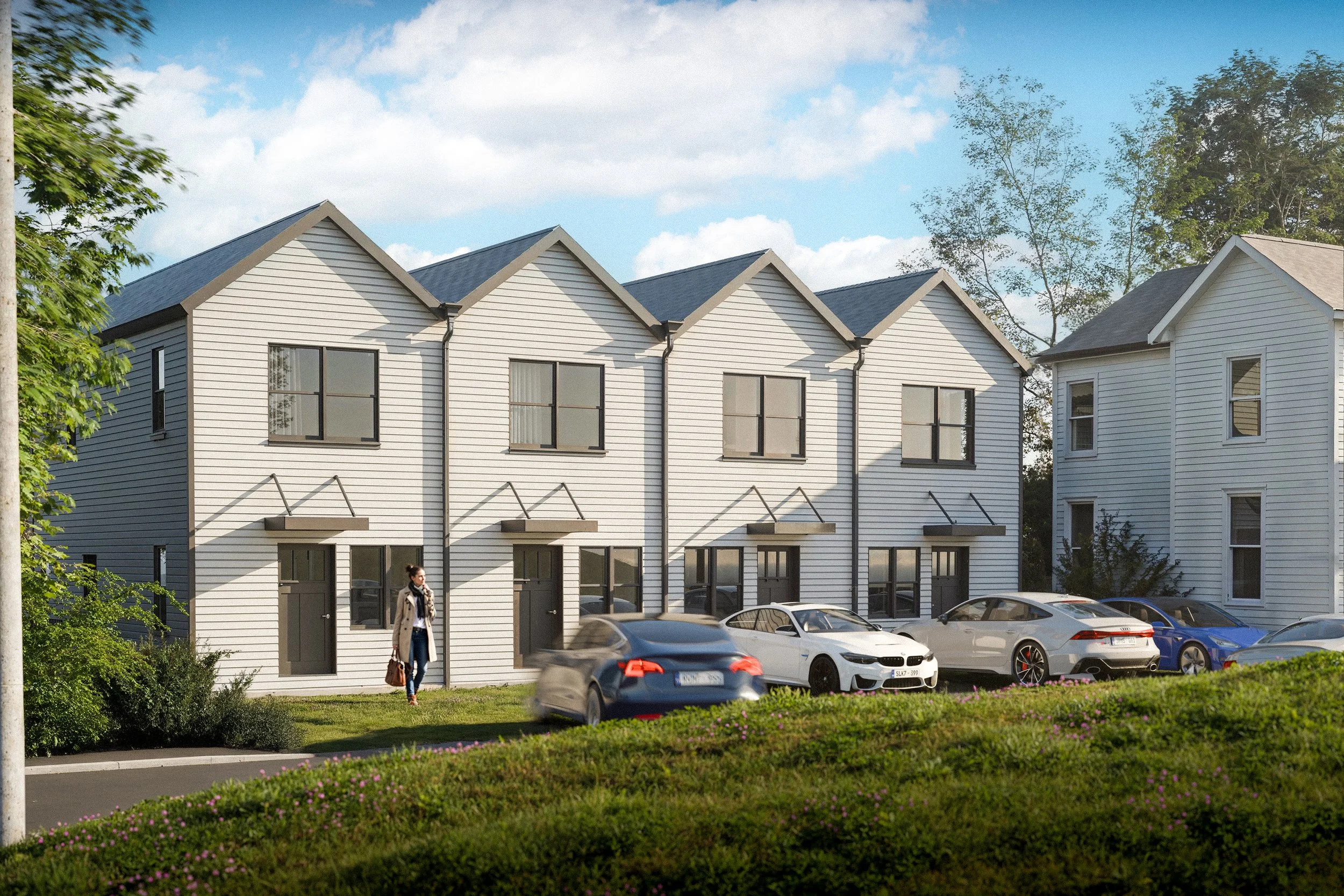 Windows & Doors – Black trim; 9' sliding deck door; basement windows in white (flat).
