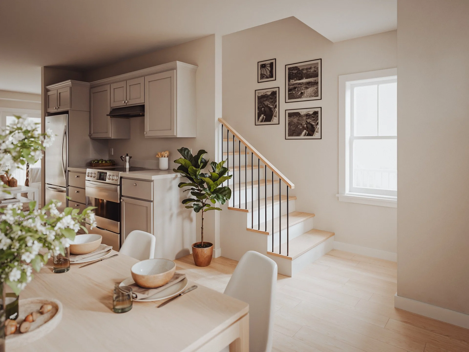 Structural & Surfaces – Alabaster White walls, Cali Vinyl Select “Blonde Ale” flooring.Staircase Details: